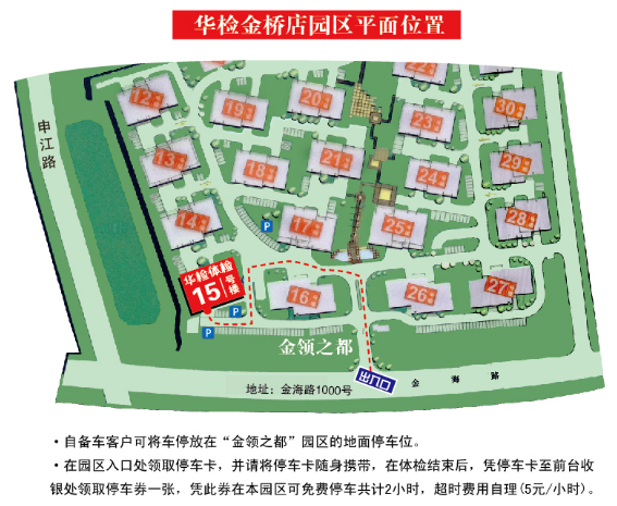 2. 在园区入口处领取停车卡,并请务必将停车卡随身携带至华检体检中心,在体检结束后,凭停车卡至前台收银处领取2小时免费停车券一张,超时费用自理(5元/小时)。