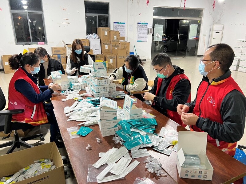 在前哨路231弄,这个约800位居民的小区,志愿者队伍非常壮大,他们自创“竹竿”管理法,手拿“竹竿”将小区居民的核酸队伍和走位路线规划得井然有序。日落前后完成庆荣路上巡查工作后,到了晚上9时,只见下辖5个居民区的庆华居委小伙伴们还在拆分抗原试剂套装,为明天工作做准备。有谁知道,眼前的他们3月22日至今一个月,没回过家、没睡过完整觉。