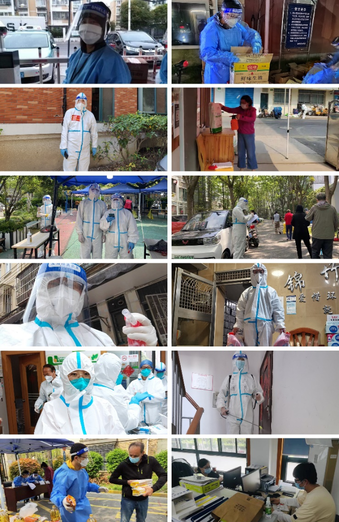 随身带着党旗迎风旗,让党旗飘扬在社区物资转运手推车上的顾钧老师;因居委消毒用酒精告急,报到的同时给居委送上20瓶消毒酒精的邱楚君老师;背着几十斤消杀设备一层一层爬楼梯进行楼道消杀的王鹏老师;保障群众配药“不断档”的曹萱、王为娟老师;在块区开展沿街社会面巡查、社会面流动人员核酸抗原工作的蔡翔华老师;关心关爱残障人士、高龄老人,送蔬菜等生活物资上门的顾佳凯、丁申楠老师;接过老楼长的班,负责片区管理的朱定赟老师;协助组织核酸采集、抗原检测试剂发放、接送检测医生,搬运分发政府大礼包和居民团购物资的苑文仪、郑爱芳、张芳芳、裴忠民、李欣、张宁、刘任佳、夏磊等老师……他们都闻令而动,全力奋战在疫情防控的第一线。