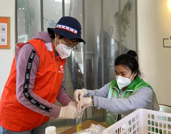 王喆老师(右一)和志愿者一起分装抗原检测物品