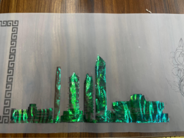 团队材料小组成员结合学科特色,尝试以新型材料——光子晶体与非遗走马灯相结合进行制作。基于光子晶体介电材料折射率差异大,能形成光子能带结构间带隙,阻止光子进入光子晶体,从而折射出不同光彩原理,小组成员采用胶体自组装法制作光子晶体膜,覆在走马灯上的外壁,使得原本水墨风格的城市标志性建筑剪影焕发出流光溢彩的视觉效果。这样的结合既是产品材料的升级,也呈现出学生们希望红色文化在城市发展中焕发蓬勃生机的美好愿景。
