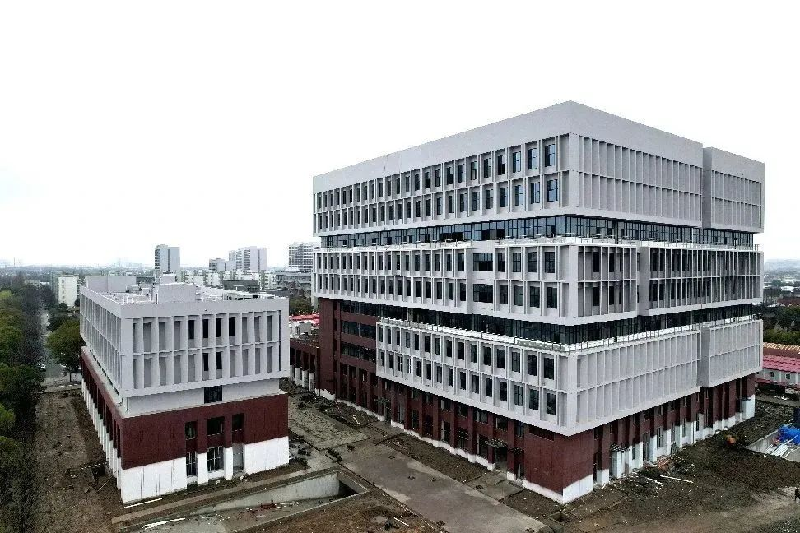 该项目总建筑面积88020平方米,其中地上建筑面积71500平方米,地下建筑面积16520平方米,总投资约5.5亿元。设计以“形式追随功能”为原则,建筑风格简约、平朴,色彩淡雅,简洁明快,大体量的建筑形态塑造特征鲜明的几何形象,与既有校园融合共生。项目于2020年10月开工,目前主体结构已完成,正在进行门窗工程、装饰装修工程和机电安装工程,计划于2023年4月竣工。