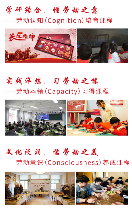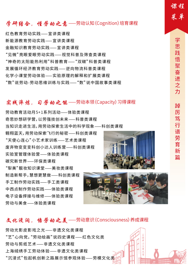 开门办好学,“大中小”一体,大学劳动教育成果也化为中小学劳动教育的“3C”课程。解放日报·上观新闻记者了解到,“3C”劳育课程在于培育学生劳动认知(Cognition)、帮助学生掌握劳动本领(Capacity)、促进学生形成劳动意识(Consciousness),目前划分为三大课程模块:学研结合,懂劳动之意;实践淬炼,习劳动之能;文化浸润,悟劳动之美,涵盖电子设备焊接、废弃物改造、绒绣体验等27种“小课堂”,赋能中小学校“学弟学妹”。