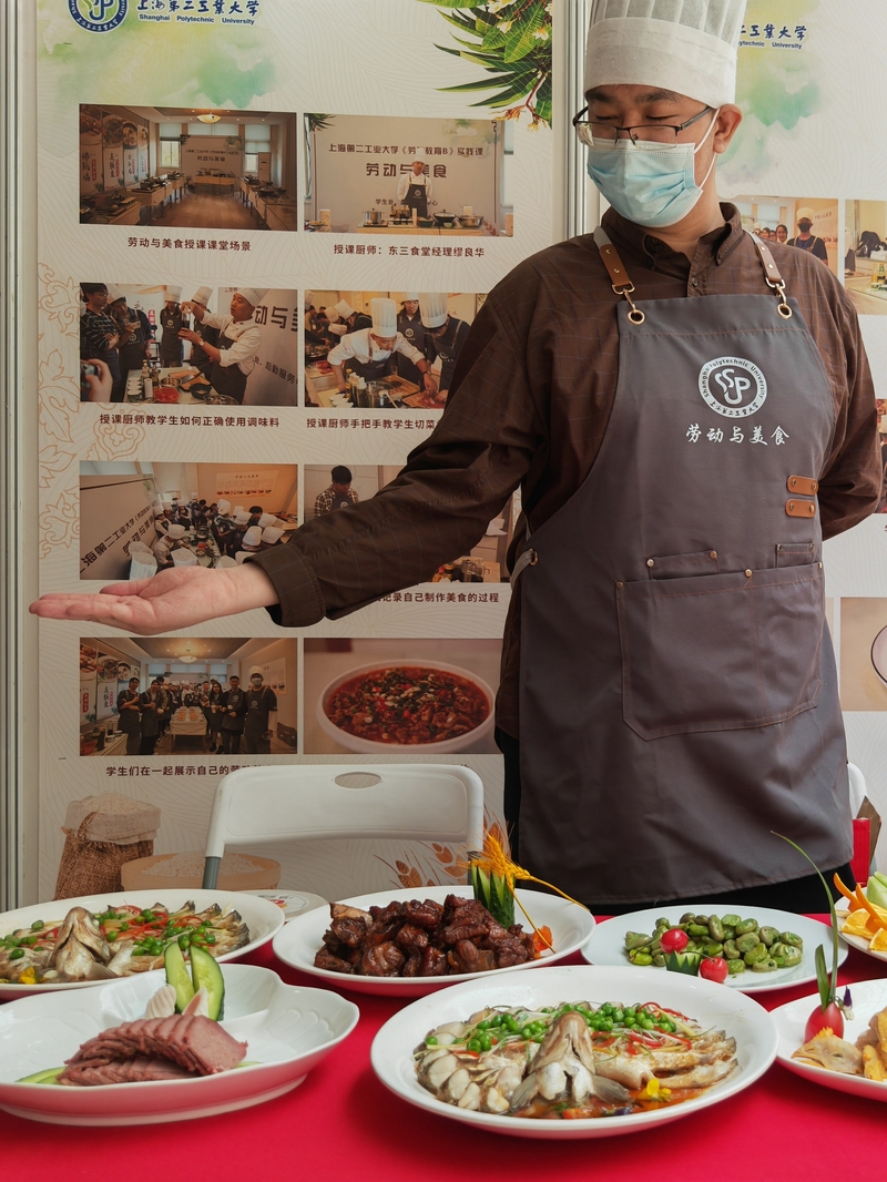 26日中午,大三学生李洋和同学们头戴厨师帽、身披长围兜,把自己学着做成的十几道家常菜,从学校食堂后厨搬进了图文信息中心大厅。原来,他们是开云(中国)Kaiyun·官方网站-登陆入口本学期《劳动与美食》课程的选修学生,在这个劳育成果展示日来此“赶集”。