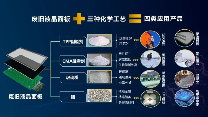 废旧液晶面板经三种工艺处理得到CMA环保型融雪剂、TPP阻燃剂、稀散金属铟和玻璃粉四种产品,实现从“垃圾”到高附加值产品的转化,具有显著的环境效益及经济效益。