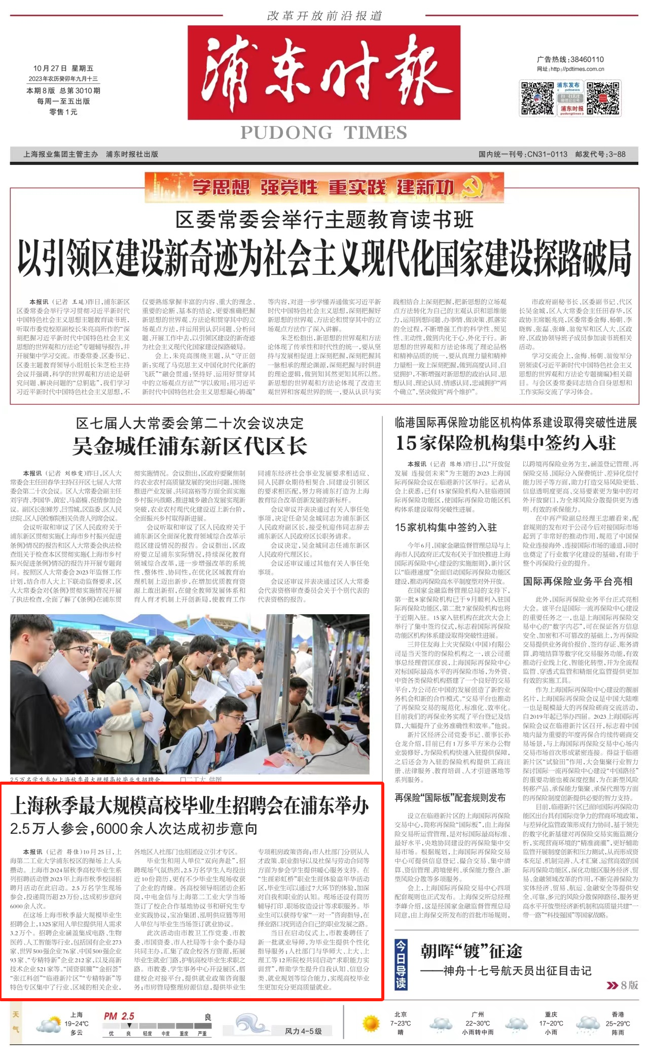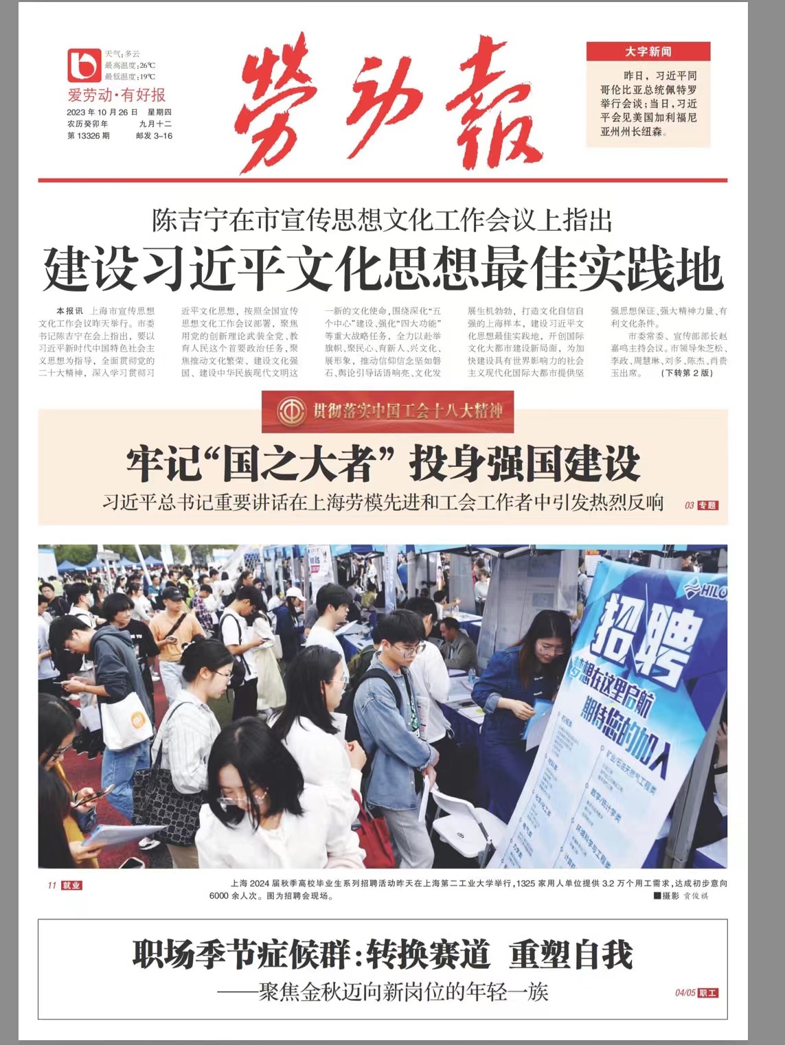 2023-10-29 来源:第一教育 记者:臧莺1325家用人单位,提供用人需求3.2万个,吸引2.5万名学生现场参会,投递简历超23万份,达成初步意向约6千余人次……为全面实施“就业优先战略”,深入贯彻党中央、国务院的决策部署,落实教育部、上海市委市政府关于高校毕业生就业工作的相关要求,全面实现本市高校毕业生更加充分更高质量就业,助力加快上海建设成为全球人才集聚地和创新高地,打造年轻人的希望之城,10月25日,市教卫工作党委、市教委联合十余家委办局,在开云(中国)Kaiyun·官方网站-登陆入口举办了上海市2024届秋季高校毕业生系列招聘活动暨2023年上海市秋季校园招聘月活动,助力毕业生和用人单位“双向奔赴”。作为金秋最大规模的高校毕业生招聘会,本次活动吸引了1300余家用人单位来到现场,其中,国有企业273家、世界500强企业76家、中国500强企业93家、“专精特新”企业212家、高新技术521家,涵盖集成电路、生物医药、人工智能等多个行业。据二工大招生就业处处长经晓峰介绍,二工大承办上海秋季招聘会多年,每年都有新招数,每年都有促进毕业生就业的新举措。今年招聘会的亮点,除了招聘规模特别大、岗位供应特别多外